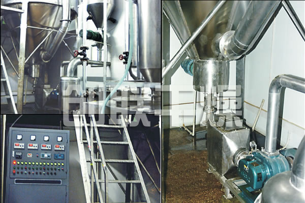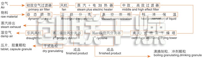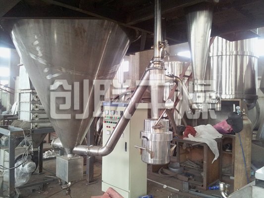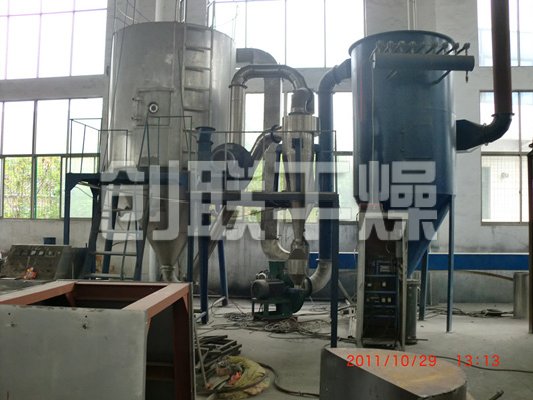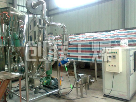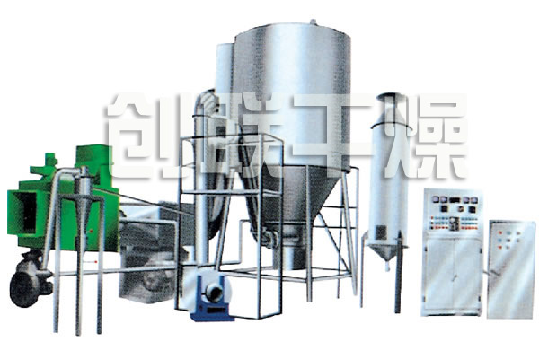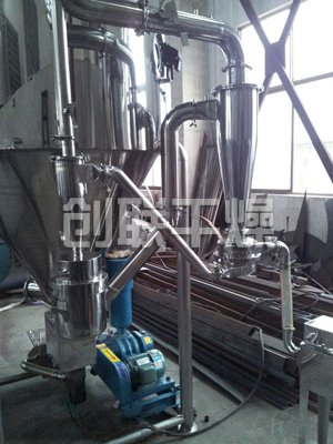 該機采用全封閉形式,所有部件均采用不銹鋼制造,配有三級凈化裝置,過(guò)濾后的空氣達十萬(wàn)級要求。筒體與頂部裝有冷壁裝置,使壁溫<80℃,干燥塔內裝有氣刷掃塔裝置。經(jīng)該機干燥后的中藥浸膏粉,不會(huì )出現焦化變質(zhì)現象,大大增加了收粉率(95%以上),而且不會(huì )產(chǎn)生混藥現象和粘壁現象。