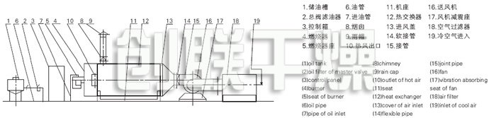 型號 燃燒器型號 燃油量kg/h 供熱量104kcal/h 外形尺寸L×W×Hmm 熱風(fēng)口L×Wmm 總重kg